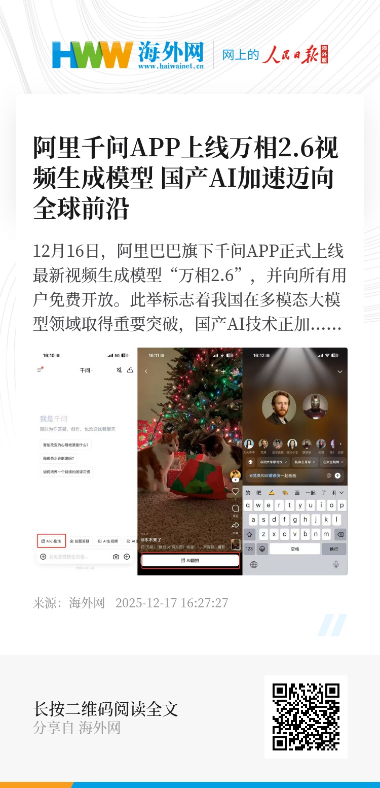 12月16日,阿里巴巴旗下千问APP正式上线最新视频生成模型“万相2.6”,并向所有用户免费开放。此举标志着我国在多模态大模型领域取得重要突破,国产AI技术正加速向全球领先水平迈进。