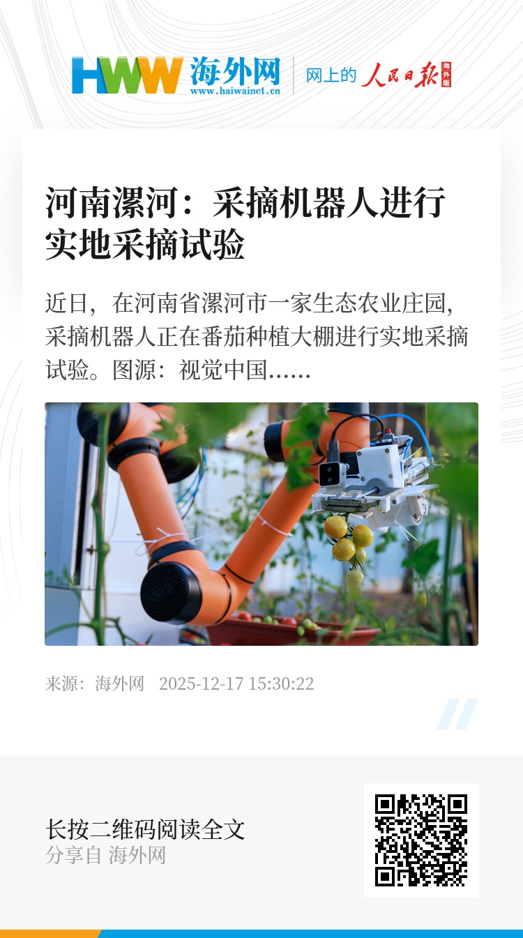32916885,.河南漯河:采摘机器人进行实地采摘试验,.2025-12-17 15:30:22,.204555,.陈菲扬、姚凯红