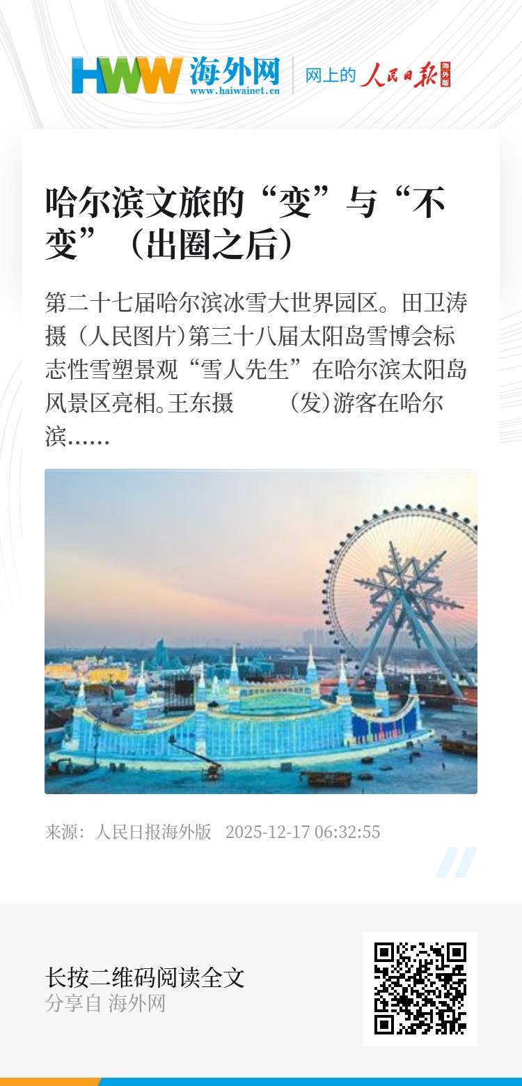 “哈尔滨的‘变’,是为了给游客和市民更好的体验;哈尔滨的‘不变’,是永远把真诚与温暖放在第一位。”王洪新说,随着冬意渐浓,哈尔滨正以更鲜活的冰雪业态、更细致的服务举措、更热情的待客之道,欢迎四海宾朋前来。(记者 刘梦丹 朱金宜)(李亚欧对本文亦有贡献)