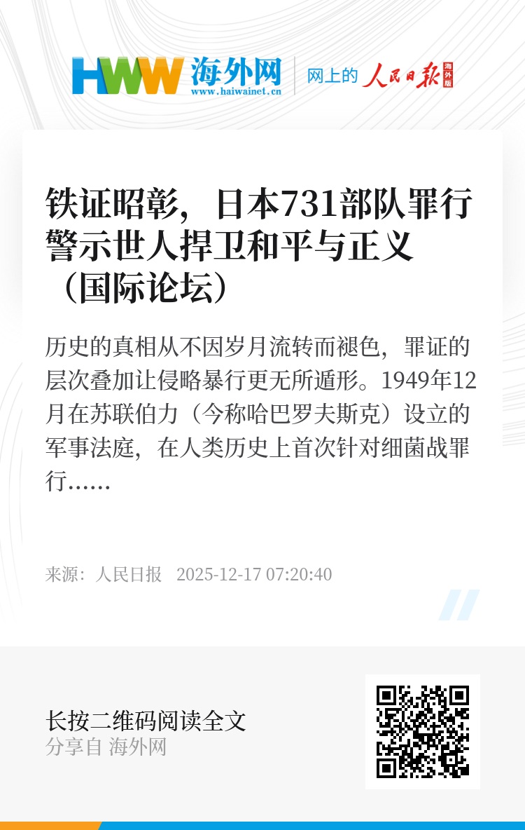 正视历史、深刻反省,是日本作为二战战败国应尽的国际义务,更是维护地区和平稳定的必要前提。伯力审判与东京审判、纽伦堡审判等国际战争审判,是二战后建立世界秩序的重要基石,731部队的反人类暴行早已被伯力审判在法律层面确立,日本东京地方法院2002年作出的一审判决,也已认定侵华日军在侵华战争中违反国际法,使用细菌武器,造成中方大量人员伤亡的事实。这些司法定论与海量铁证,都要求日本正视历史罪责。