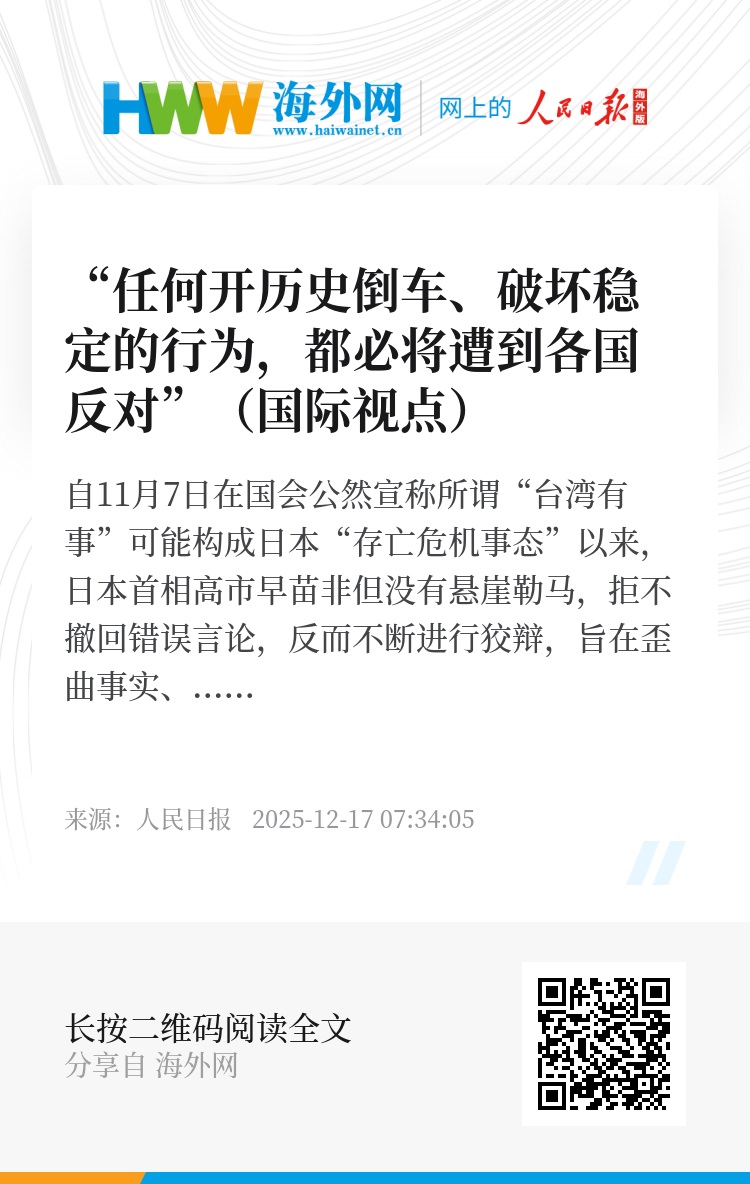 奥地利学者罗伯特·菲茨瑟姆近日在欧洲“思想”网站刊文称,高市的言论无视包括《开罗宣言》《波茨坦公告》在内的系列国际法文件,是在蓄意干涉中国内政。日本侵华战争造成了超过3500万中国军民伤亡。1945年之前日本对台湾进行残酷殖民统治。如果高市不撤回其言论,将对日本经济和中日关系造成严重损害。