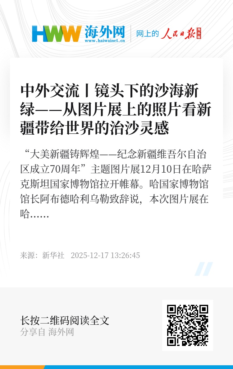 “大美新疆铸辉煌——纪念新疆维吾尔自治区成立70周年”主题图片展12月10日在哈萨克斯坦国家博物馆拉开帷幕。哈国家博物馆馆长阿布德哈利乌勒致辞说,本次图片展在哈萨克斯坦成功开幕,是两国人民民心相亲、精神与智慧和谐交流的成功范例,将进一步深化两国在人文领域的合作。