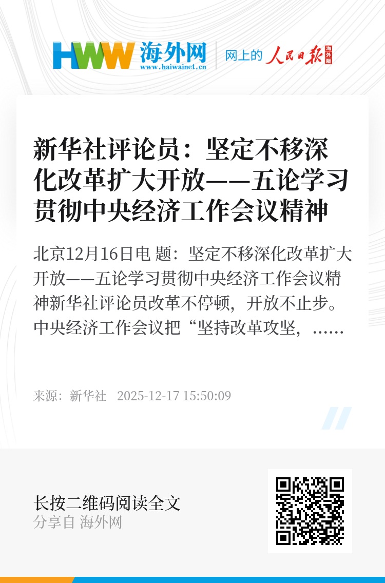 新华社北京12月16日电 题:坚定不移深化改革扩大开放——五论学习贯彻中央经济工作会议精神
