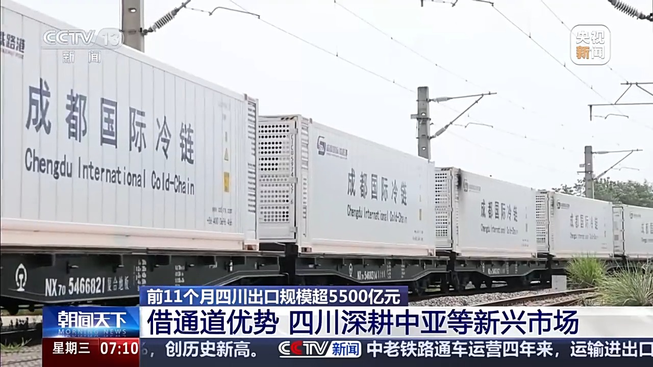 成都海关统计分析处副处长 肖晓文:今年前11个月,四川对中亚市场出口超60亿元,同比增长近三成。其中,对哈萨克斯坦出口同比增长1.2倍。对中亚五国出口的产品中,汽车、光伏产品、锂电池、电视机等占比较大。