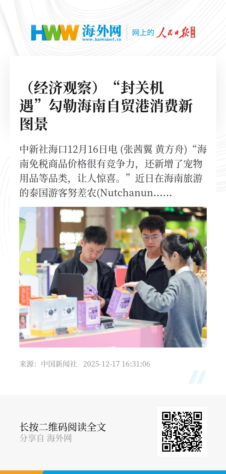 中新社海口12月16日电 (张茜翼 黄方舟)“海南免税商品价格很有竞争力,还新增了宠物用品等品类,让人惊喜。”近日在海南旅游的泰国游客努差农(Nutchanun Klaysun)专程前往免税店“扫货”。她告诉记者,离境的外国旅客同样能便捷享受免税购物福利,这让海南之行更具吸引力。