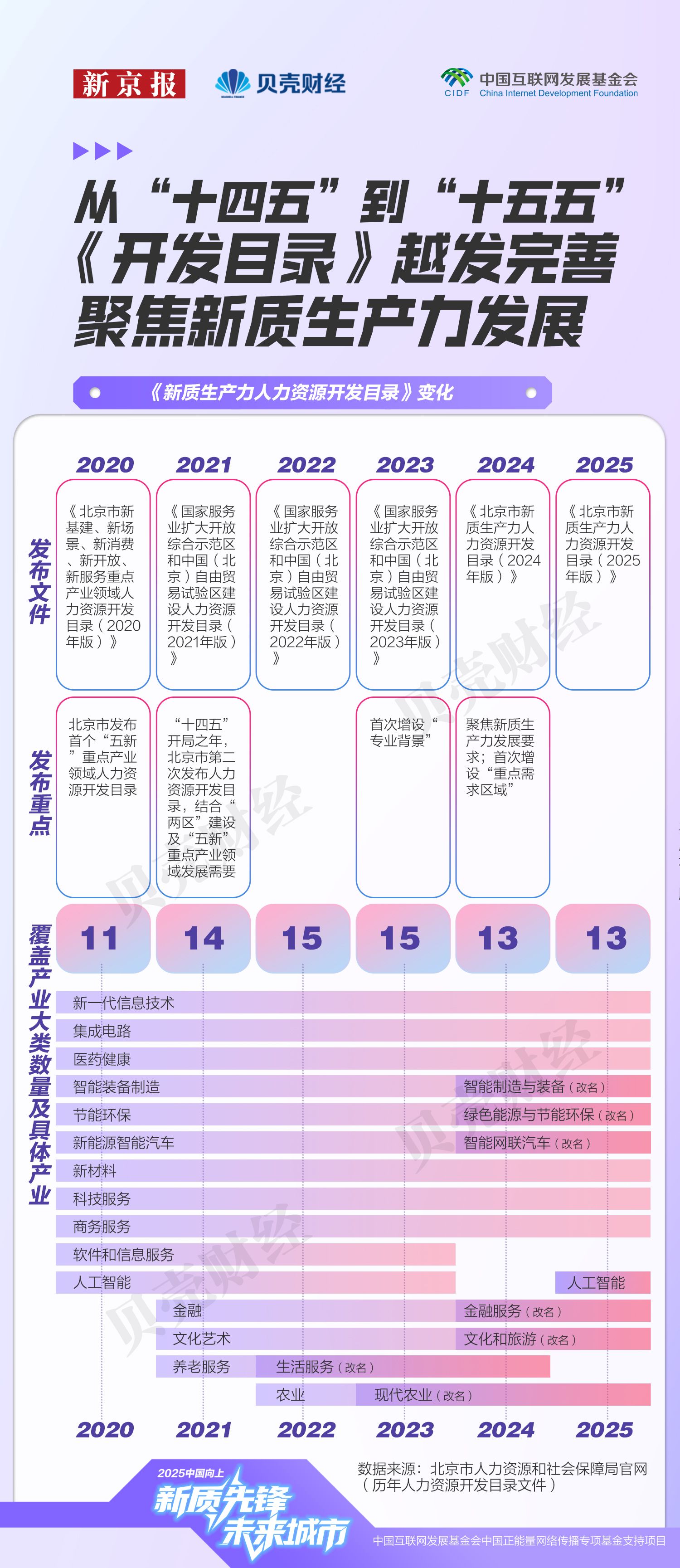 2024年目录升级为《新质生产力人力资源开发目录》,并在2025年继续更新。从设定人才需求评级,到增设重点需求专业及重点需求区域,目录体系逐步完善,已成为北京人才供求市场的重要“晴雨表”。
