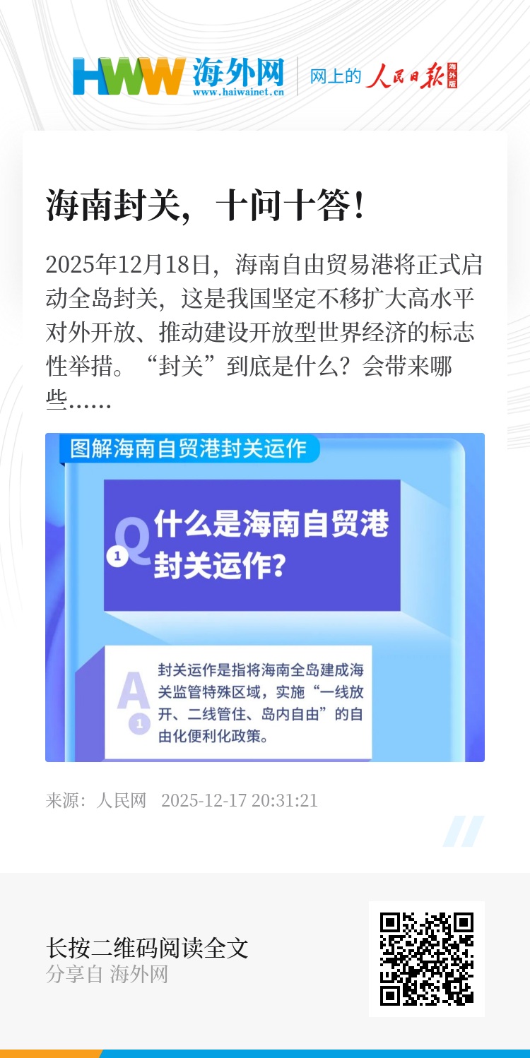 2025年12月18日,海南自由贸易港将正式启动全岛封关,这是我国坚定不移扩大高水平对外开放、推动建设开放型世界经济的标志性举措。“封关”到底是什么?会带来哪些实际好处?人员进出海南受影响吗?让我们通过10个精选问答为您解读。