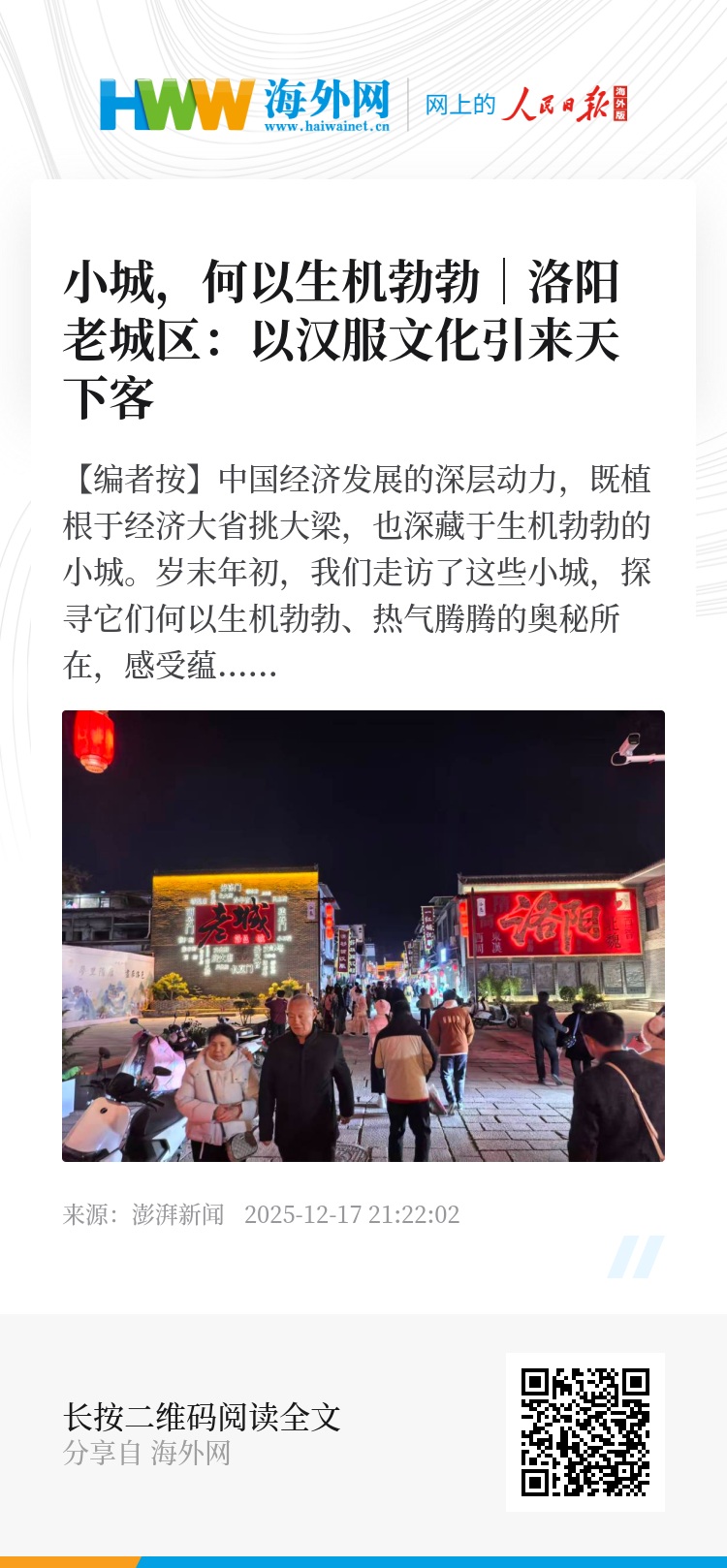 “几年前,这里还不是火遍全网的汉服打卡地。这几年文旅发展了,很多人都吃上了旅游饭。”老城区是洛阳历史资源最丰富的区,也是现在文旅发展最有活力的区。洛邑古城民宿老板司薇,常常庆幸当初把民宿选址在了这里。
