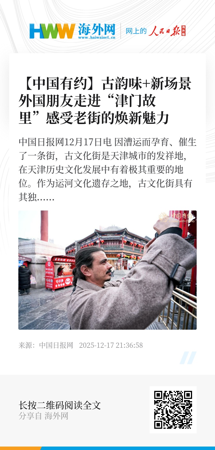 中国日报网12月17日电 因漕运而孕育、催生了一条街,古文化街是天津城市的发祥地,在天津历史文化发展中有着极其重要的地位。作为运河文化遗存之地,古文化街具有其独特的代表性,可以说,这条街是天津城市的图腾。12月16日,2025“中国有约·魅力天津”国际采访团来到这里,感受古韵老街的焕新魅力。