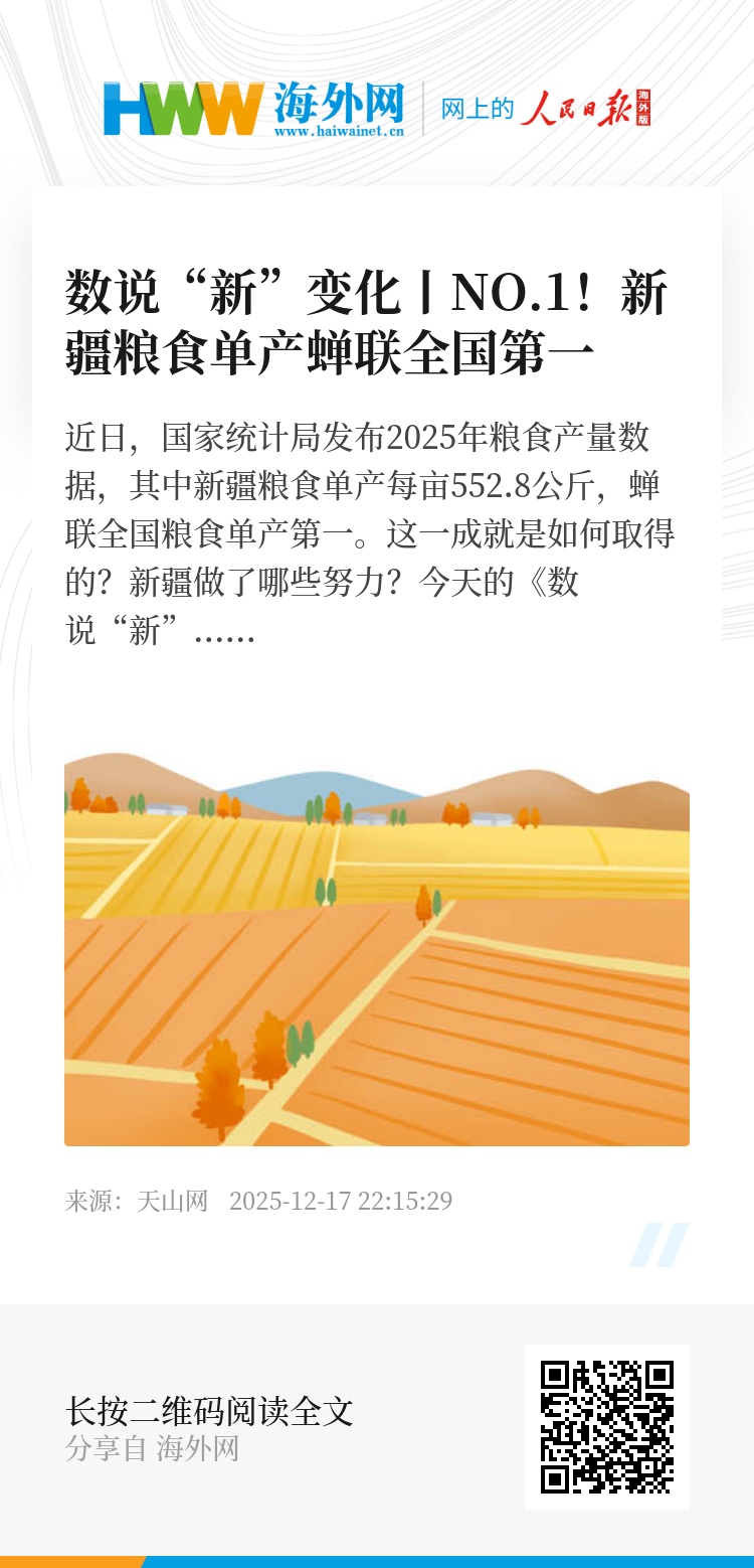 近日,国家统计局发布2025年粮食产量数据,其中新疆粮食单产每亩552.8公斤,蝉联全国粮食单产第一。这一成就是如何取得的?新疆做了哪些努力?今天的《数说“新”变化》一起来看看。