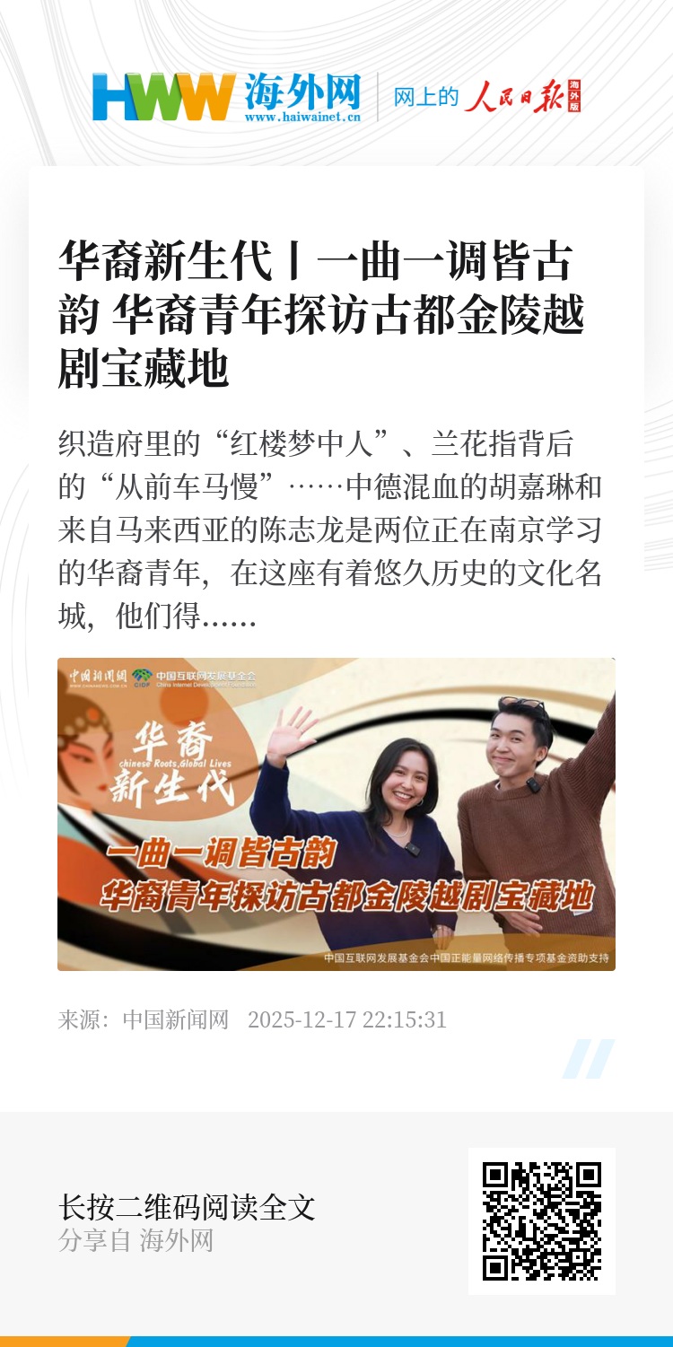 织造府里的“红楼梦中人”、兰花指背后的“从前车马慢”……中德混血的胡嘉琳和来自马来西亚的陈志龙是两位正在南京学习的华裔青年,在这座有着悠久历史的文化名城,他们得以无限接近丰富多元的中华传统文化。
