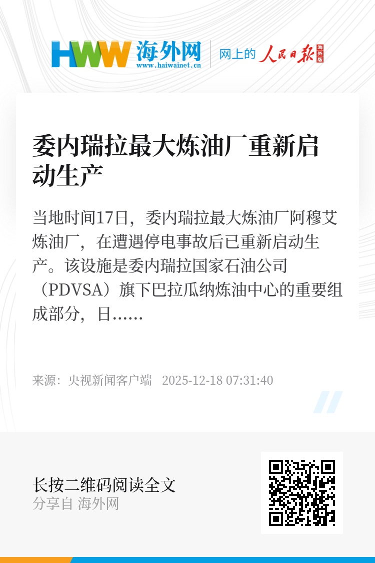 当地时间17日,委内瑞拉最大炼油厂阿穆艾炼油厂,在遭遇停电事故后已重新启动生产。该设施是委内瑞拉国家石油公司(PDVSA)旗下巴拉瓜纳炼油中心的重要组成部分,日产能为64.5万桶,其运营稳定性对委内瑞拉国内燃料供应及石油出口具有关键影响。(总台记者 马天静)