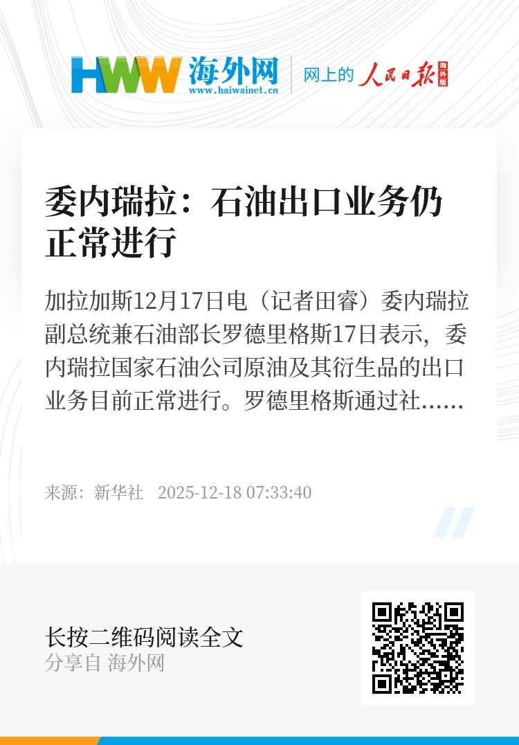 新华社加拉加斯12月17日电(记者田睿)委内瑞拉副总统兼石油部长罗德里格斯17日表示,委内瑞拉国家石油公司原油及其衍生品的出口业务目前正常进行。