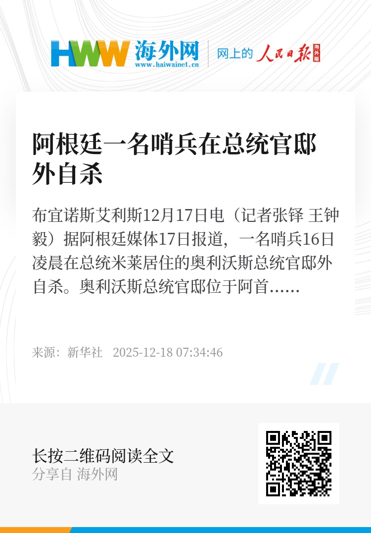 新华社布宜诺斯艾利斯12月17日电(记者张铎 王钟毅)据阿根廷媒体17日报道,一名哨兵16日凌晨在总统米莱居住的奥利沃斯总统官邸外自杀。