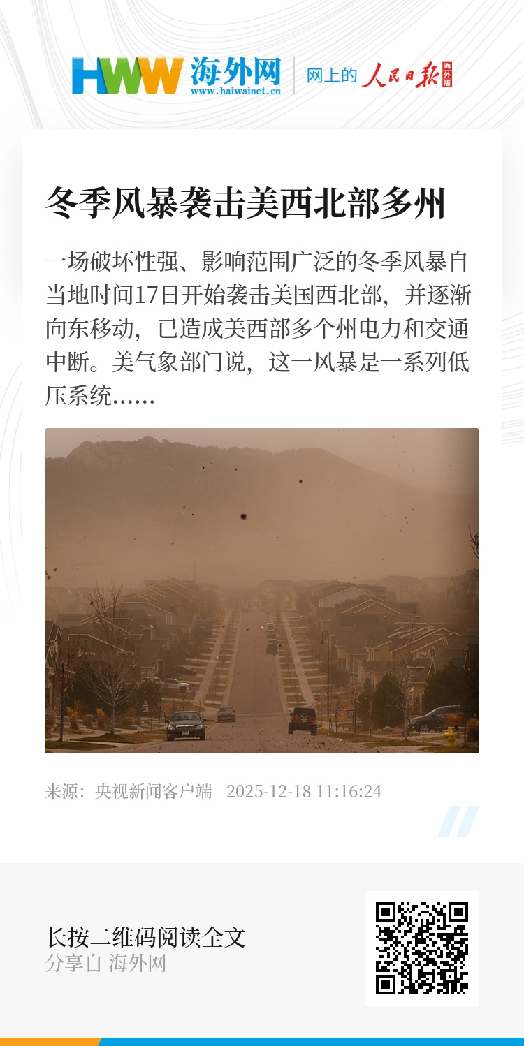 一场破坏性强、影响范围广泛的冬季风暴自当地时间17日开始袭击美国西北部,并逐渐向东移动,已造成美西部多个州电力和交通中断。