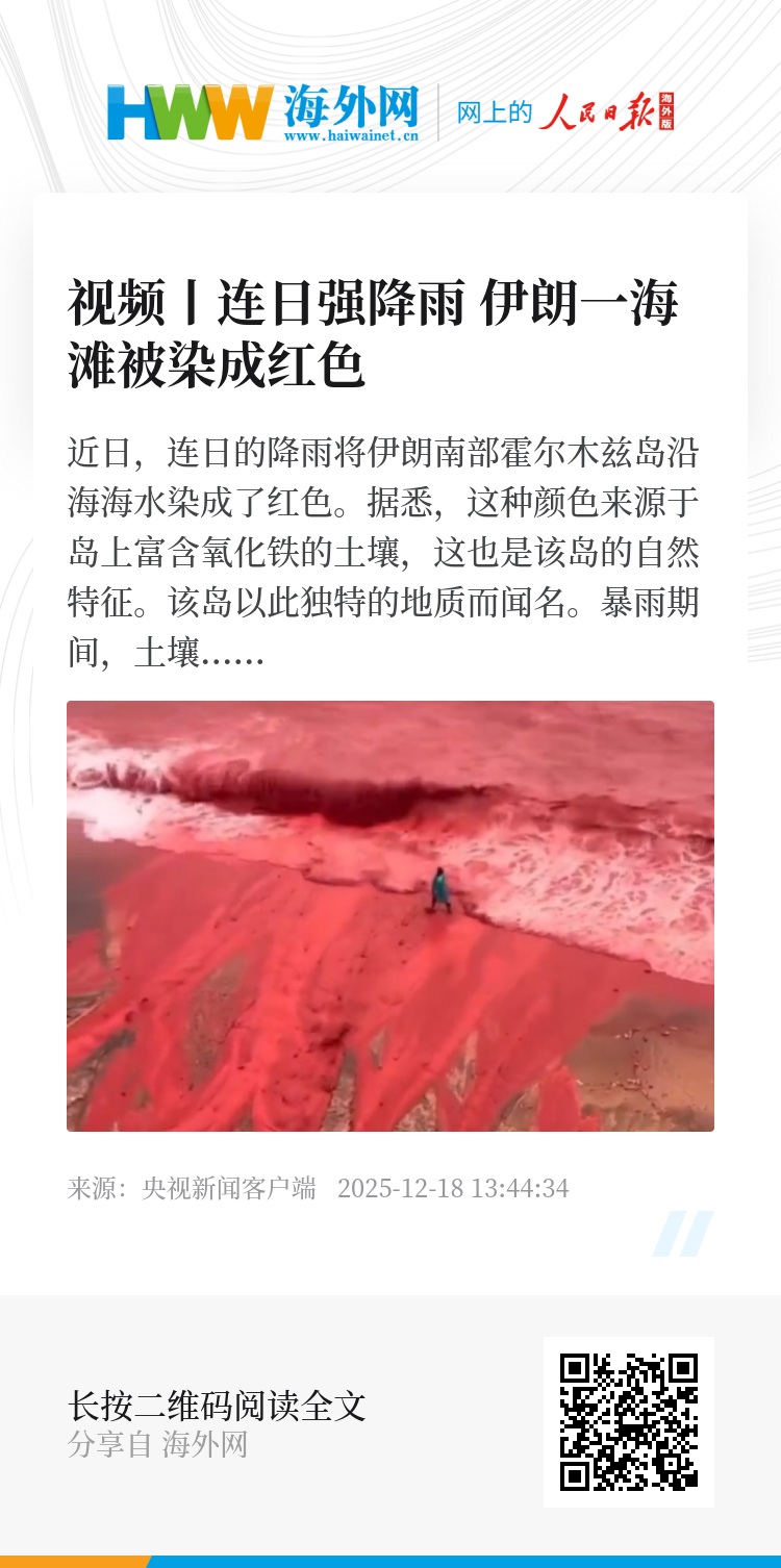 近日,连日的降雨将伊朗南部霍尔木兹岛沿海海水染成了红色。