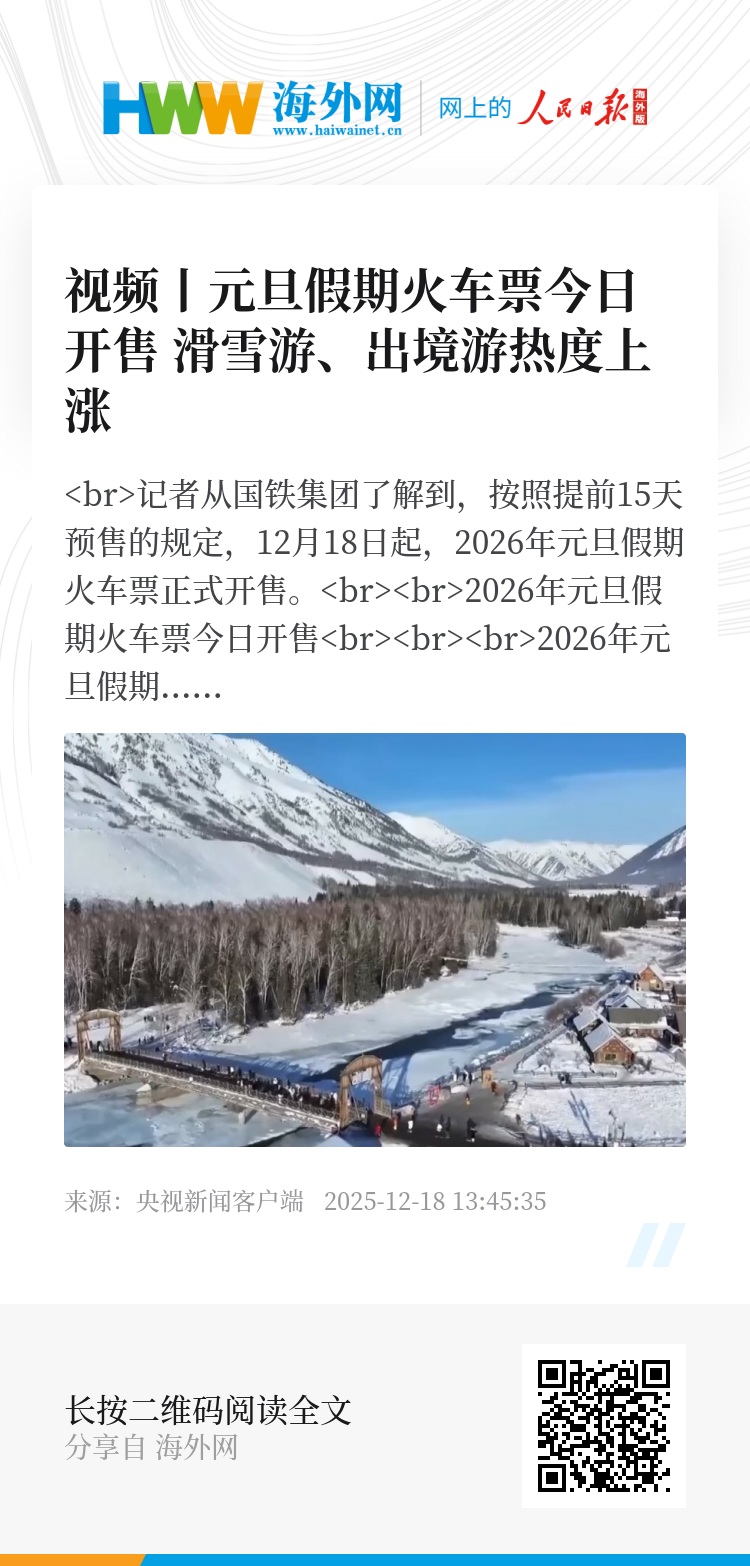 记者从国铁集团了解到,按照提前15天预售的规定,12月18日起,2026年元旦假期火车票正式开售。