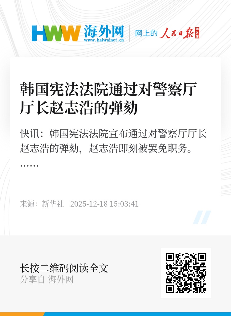 新华社快讯:韩国宪法法院宣布通过对警察厅厅长赵志浩的弹劾,赵志浩即刻被罢免职务。