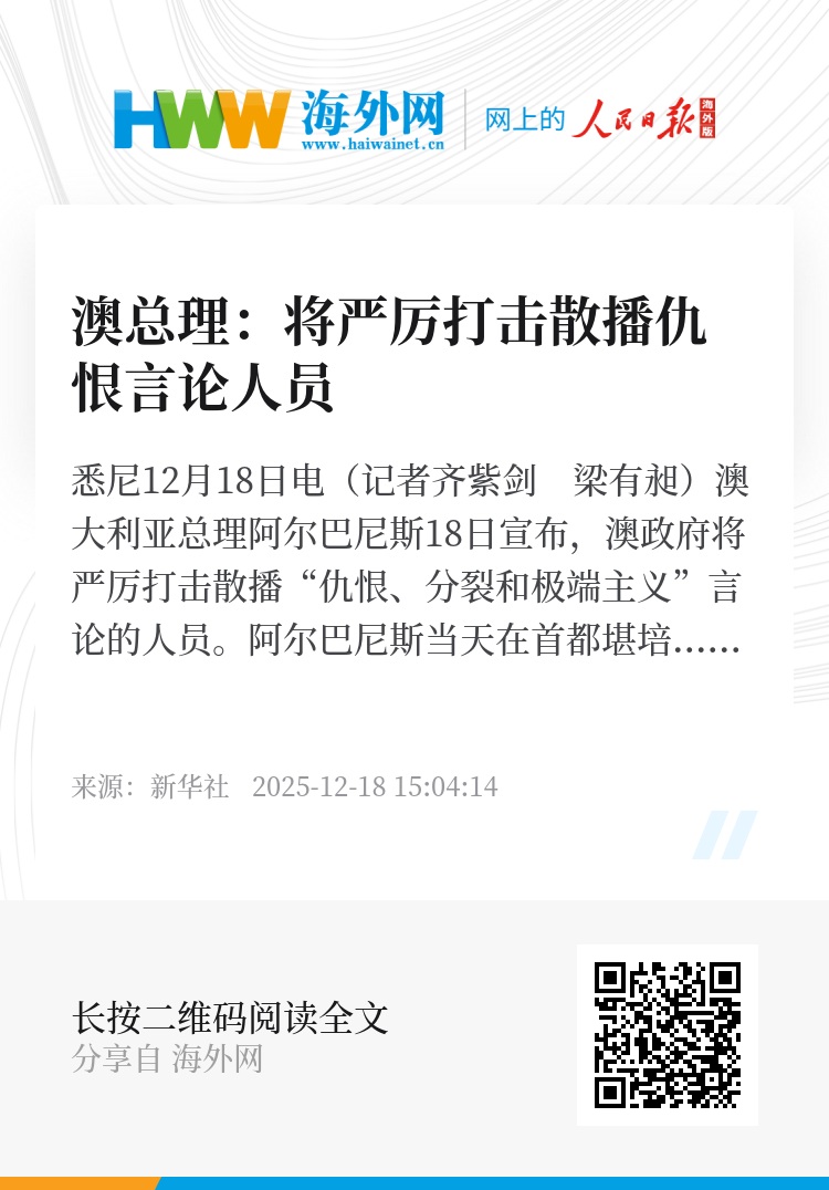 新华社悉尼12月18日电(记者齐紫剑 梁有昶)澳大利亚总理阿尔巴尼斯18日宣布,澳政府将严厉打击散播“仇恨、分裂和极端主义”言论的人员。