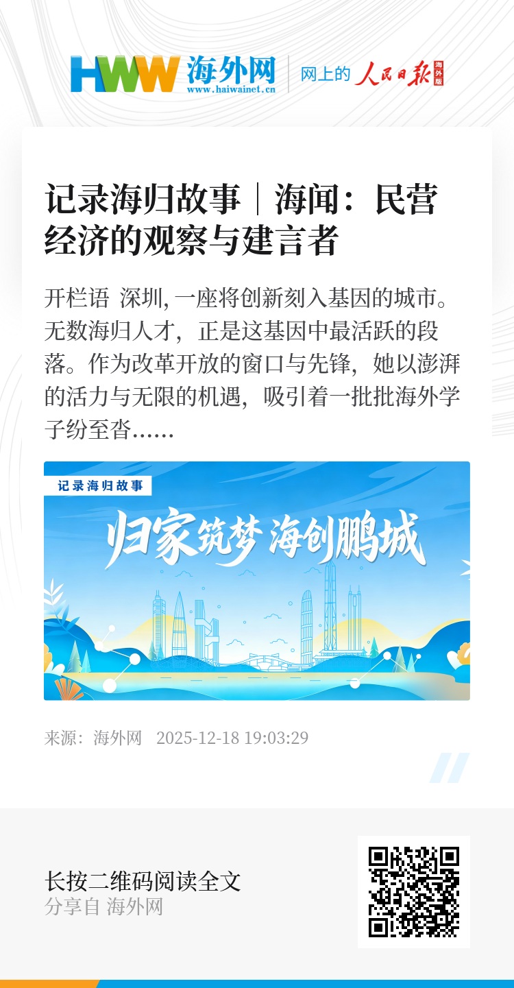 “深圳的奇迹,本质上是民营经济的奇迹,是‘种子’与‘土壤’相互成就的典范。”北京大学校务委员会副主任(原副校长)、汇丰商学院创院院长海闻教授坐在镜头前,谈及深耕多年的民营经济与深圳发展,目光中透着学者的深邃与海归的热忱。作为“归家筑梦 海创鹏城”系列专访的重要嘉宾,这位深耕经济领域数十载的海归学者,以“民营经济的观察与建言者”的身份,解码信心密码,剖析鹏城基因。