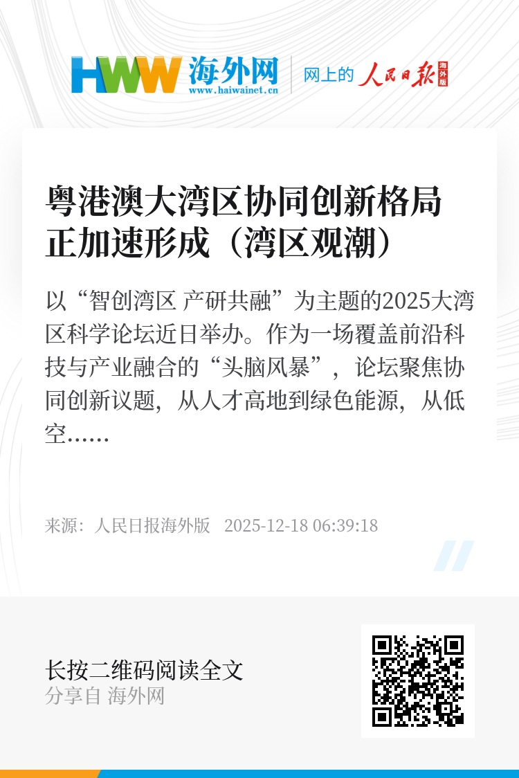 本届论坛不仅聚焦产业赛道布局,更致力于推动粤港澳三地创新主体从“协同协作”向“深度融合”跃升,为现代化产业体系注入新动能。有人深有感触地说,“下午谈技术、晚上出样品、下周试量产”的效率,不再是口号,而是“新质生产力”最生动的注脚。大湾区科学论坛的永久会址落户广州南沙明珠湾的灵山岛尖,建筑造型以“千帆竞渡、科技远航”为设计理念。如今,这艘联通中国与世界的“科技方舟”,正在劈波斩浪向辽阔,奋勇前行致万里。(任成琦)