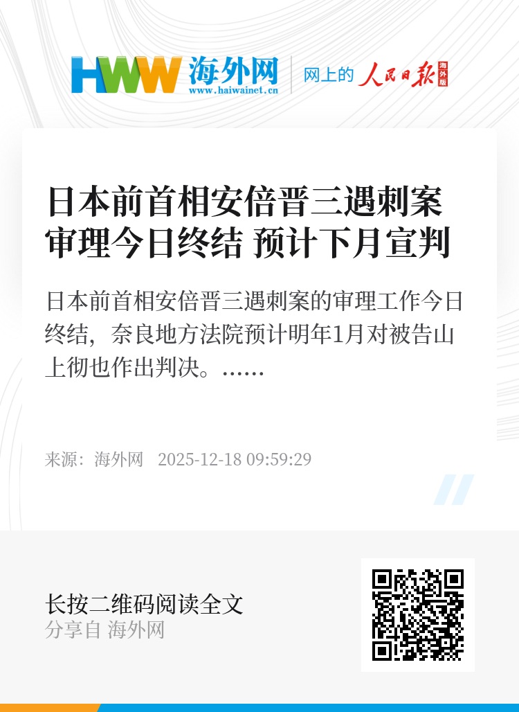 海外网12月18日电 据日本《朝日新闻》12月18日报道,日本前首相安倍晋三遇刺案的审理工作今日终结,奈良地方法院预计2026年1月对被告山上彻也作出判决。