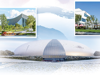 图片从左至右依次为位于京杭大运河畔的北京艺术中心、位于天安门广场西侧的国家大剧院、位于通州台湖演艺小镇的台湖舞美艺术中心。三者共同构成国家大剧院“一院三址”新格局。