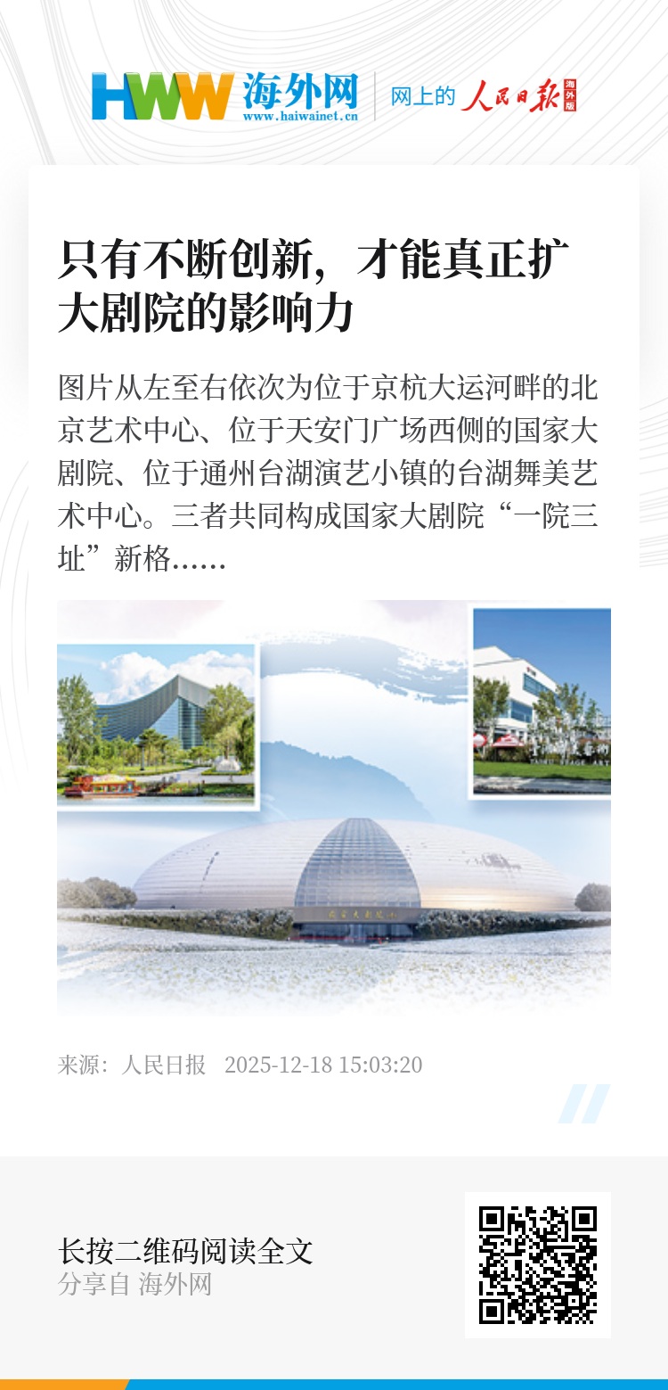未来,我们将努力以精品力作激发创新创造活力,在世界舞台艺术版图中,确立不可替代的“中国坐标”,以“一院三址”扩大品牌辐射力,依托世界剧院联盟这一平台,与世界表演艺术机构深化联合制作、人才共育、技术共享与巡演合作,让“中国舞台”风光无限。(记者 袁新文 王瑨 王珏)