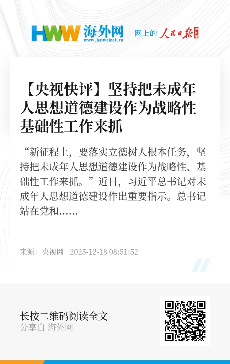 “新征程上,要落实立德树人根本任务,坚持把未成年人思想道德建设作为战略性、基础性工作来抓。”近日,习近平总书记对未成年人思想道德建设作出重要指示。总书记站在党和国家事业发展薪火相传、后继有人的高度,深刻指出做好未成年人思想道德建设工作的重要性、紧迫性。总书记的重要指示高屋建瓴、精辟深邃,进一步回答了培养什么人、怎样培养人、为谁培养人这一系列事关中国式现代化前途命运的重大问题,为我们扎实做好未成年人思想道德建设工作提供了根本遵循。