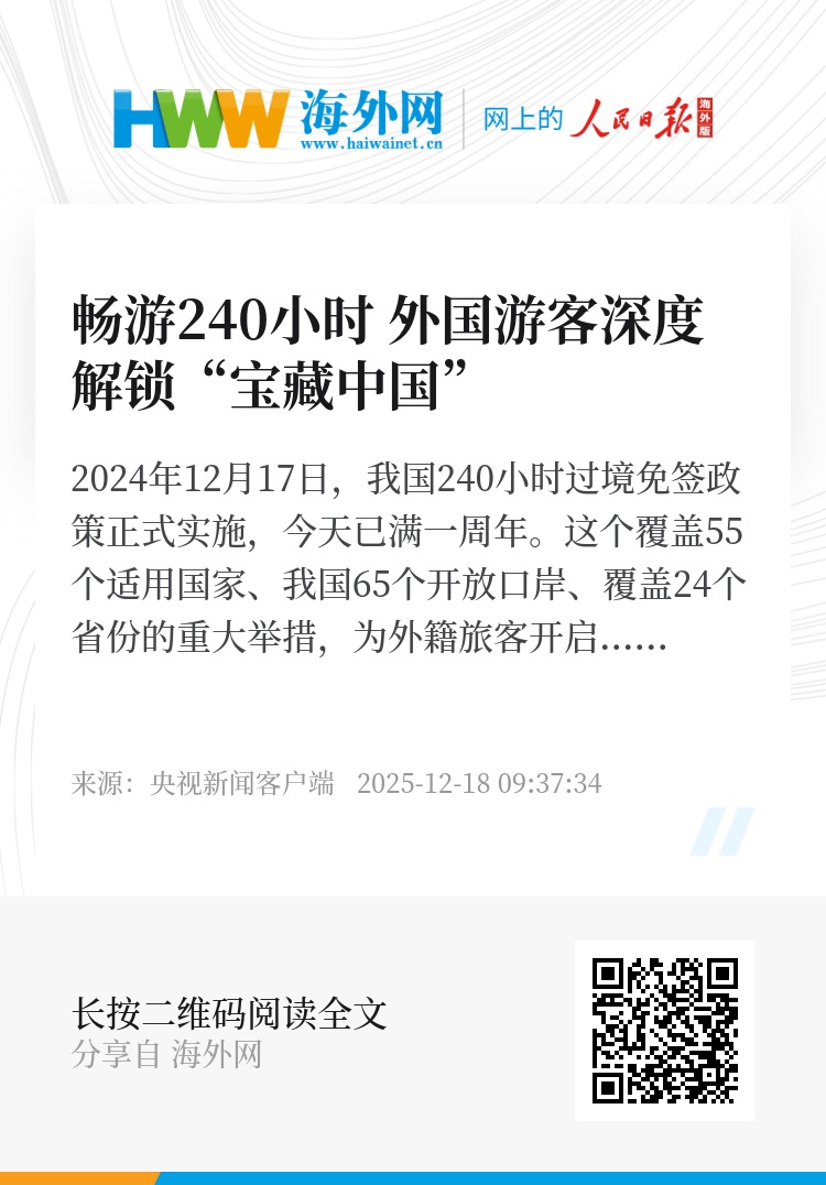 2024年12月17日,我国240小时过境免签政策正式实施,今天已满一周年。这个覆盖55个适用国家、我国65个开放口岸、覆盖24个省份的重大举措,为外籍旅客开启了便捷入境中国的全新通道。