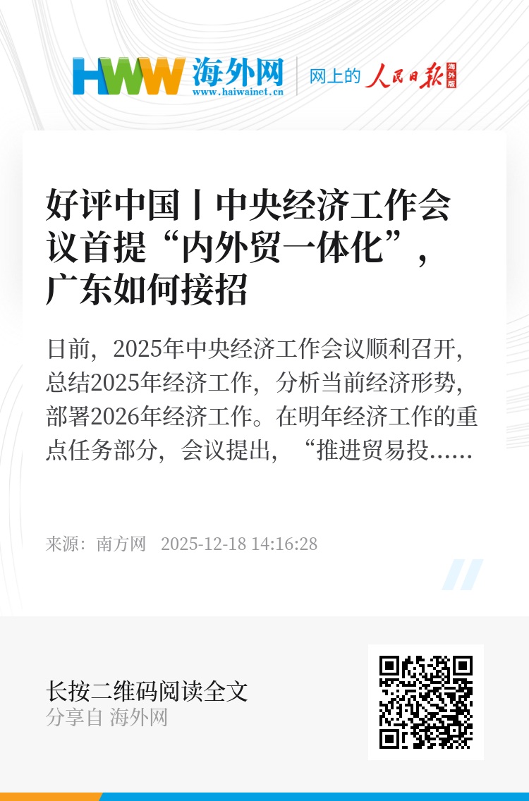 日前,2025年中央经济工作会议顺利召开,总结2025年经济工作,分析当前经济形势,部署2026年经济工作。在明年经济工作的重点任务部分,会议提出,“推进贸易投资一体化、内外贸一体化发展。”这是“内外贸一体化”第一次被写入中央经济工作会议文件,背后有着怎样的考量?作为外贸第一大省的广东,又该如何接招?