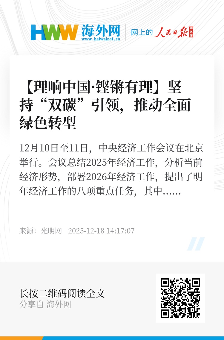 12月10日至11日,中央经济工作会议在北京举行。会议总结2025年经济工作,分析当前经济形势,部署2026年经济工作,提出了明年经济工作的八项重点任务,其中一项任务就是“坚持‘双碳’引领,推动全面绿色转型”。