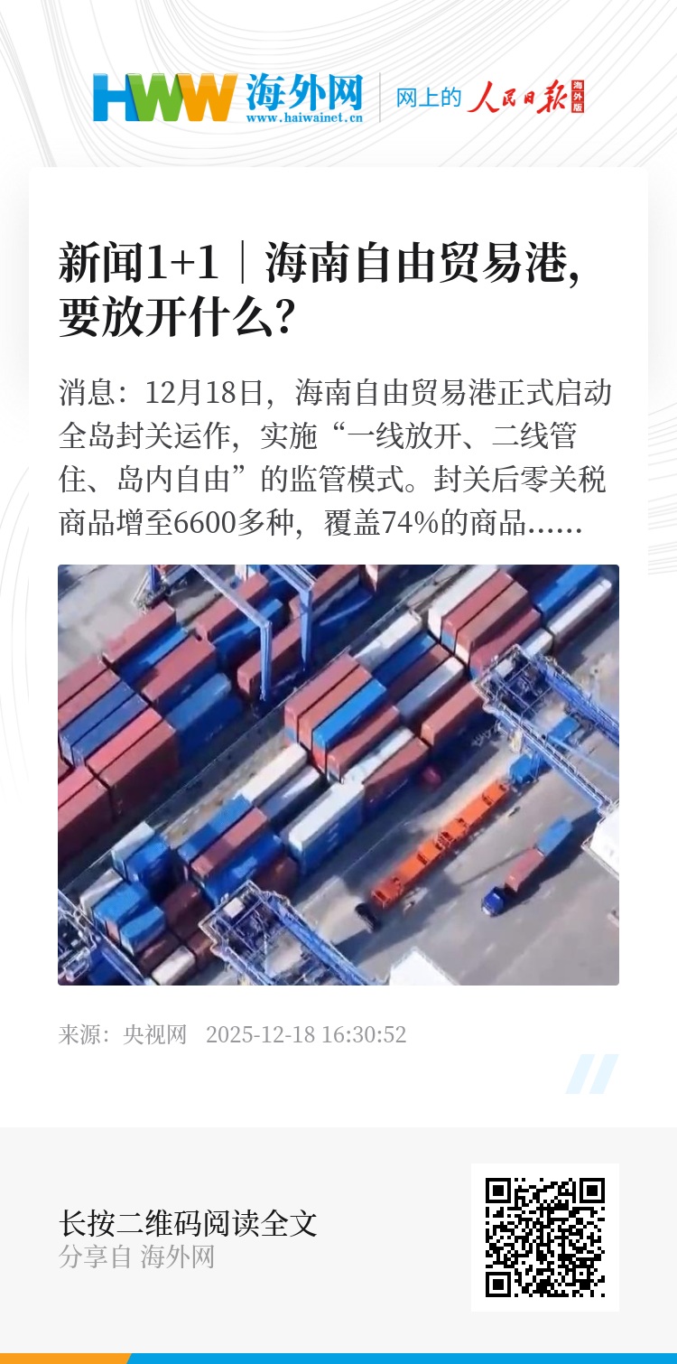 央视网消息:12月18日,海南自由贸易港正式启动全岛封关运作,实施“一线放开、二线管住、岛内自由”的监管模式。封关后零关税商品增至6600多种,覆盖74%的商品类目。