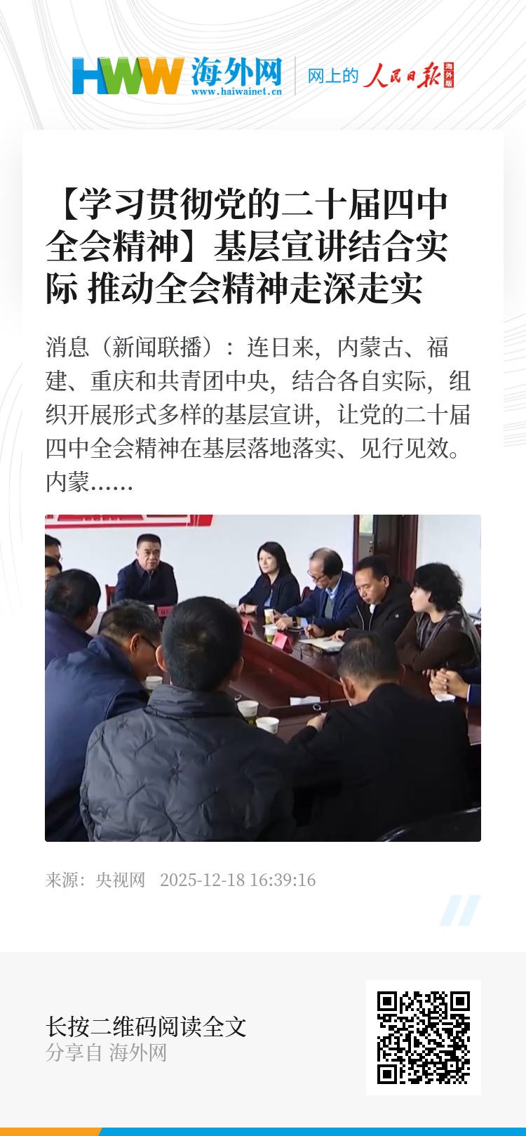 央视网消息(新闻联播):连日来,内蒙古、福建、重庆和共青团中央,结合各自实际,组织开展形式多样的基层宣讲,让党的二十届四中全会精神在基层落地落实、见行见效。