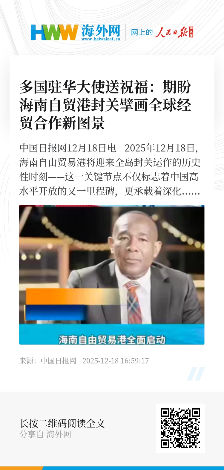 他们表示,海南自贸港的全岛封关运作,将以更开放的姿态、更高效的机制打通国内国际双循环的关键通道,显著提升全球贸易便利化水平;更期待这一创新实践能为世界各国创造更广阔的合作空间,让发展成果惠及更多伙伴,共同绘就全球经贸合作共赢的新图景。(剪辑:潘一侨 王怡文实习生 编译:宋健实习生 编辑:杨箫玮 王成孟)
