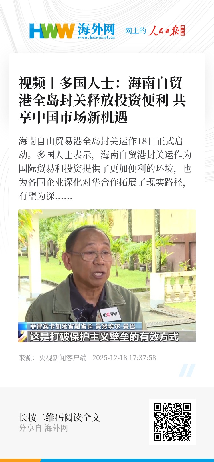海南自由贸易港全岛封关运作18日正式启动。多国人士表示,海南自贸港封关运作为国际贸易和投资提供了更加便利的环境,也为各国企业深化对华合作拓展了现实路径,有望为深化国际经贸合作注入新动能。