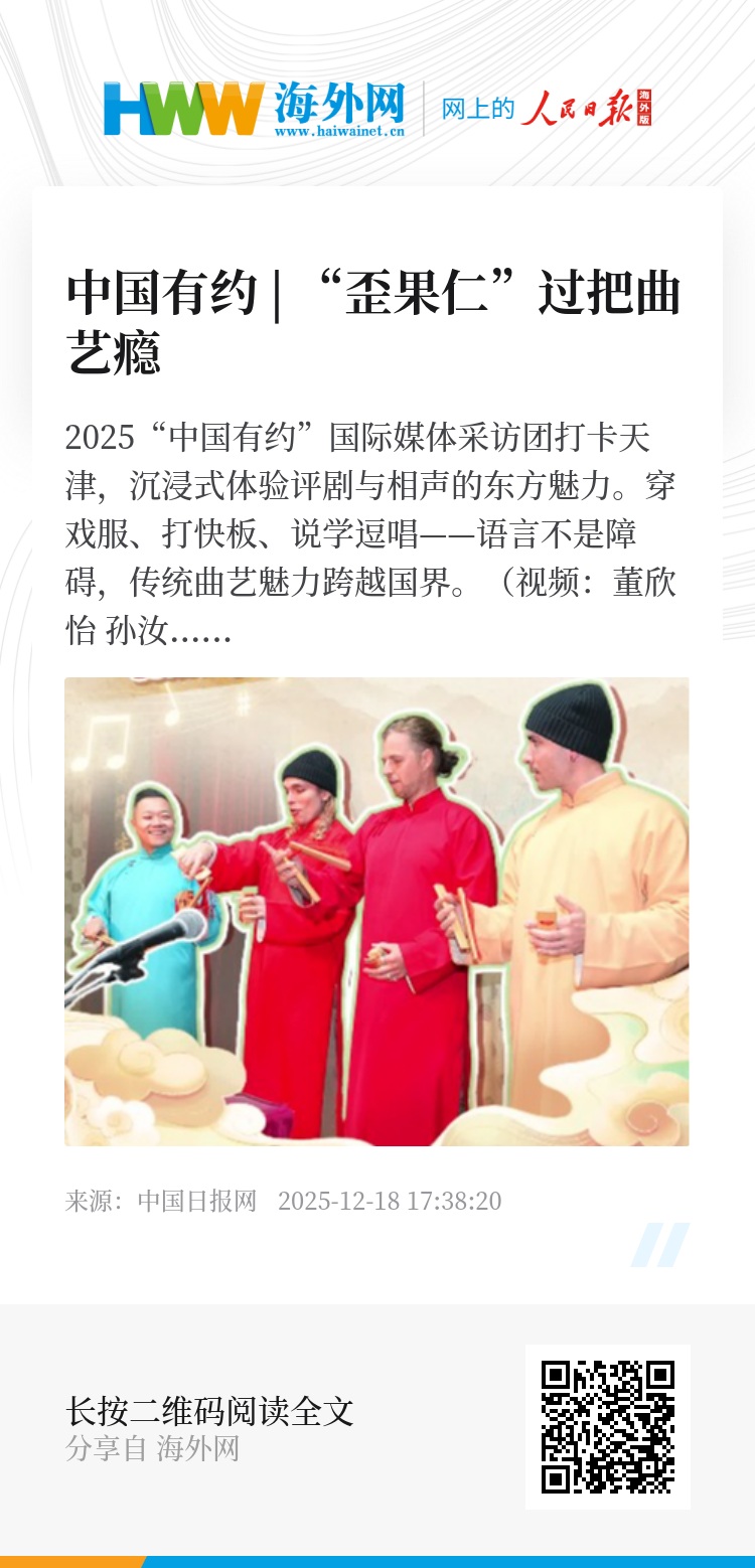 2025“中国有约”国际媒体采访团打卡天津,沉浸式体验评剧与相声的东方魅力。穿戏服、打快板、说学逗唱——语言不是障碍,传统曲艺魅力跨越国界。(视频:董欣怡 孙汝,审核:代艳 刘小卓)