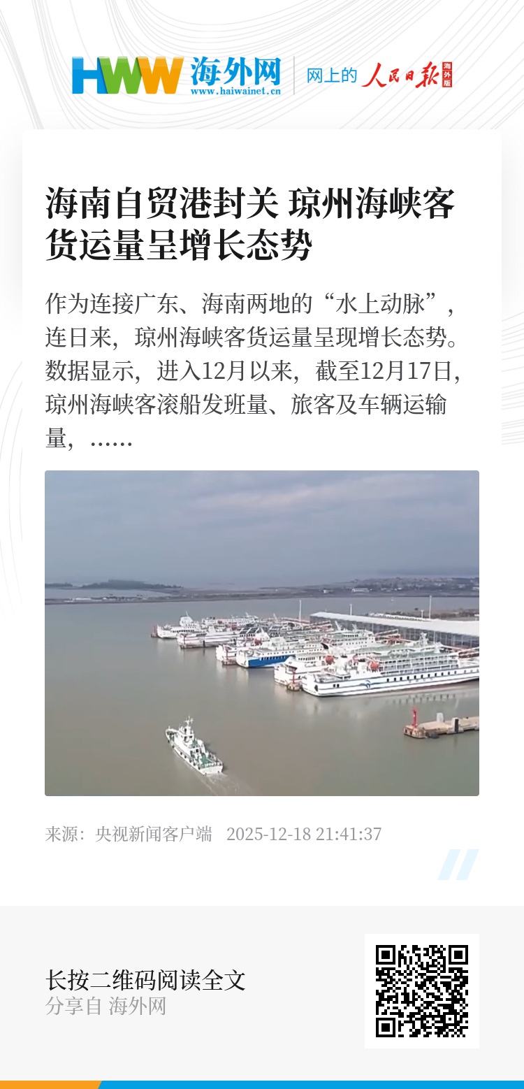 数据显示,进入12月以来,截至12月17日,琼州海峡客滚船发班量、旅客及车辆运输量,比11月同期分别增长12.7%、14.1% 、13.6%,新能源车运输量增幅达19.4%。