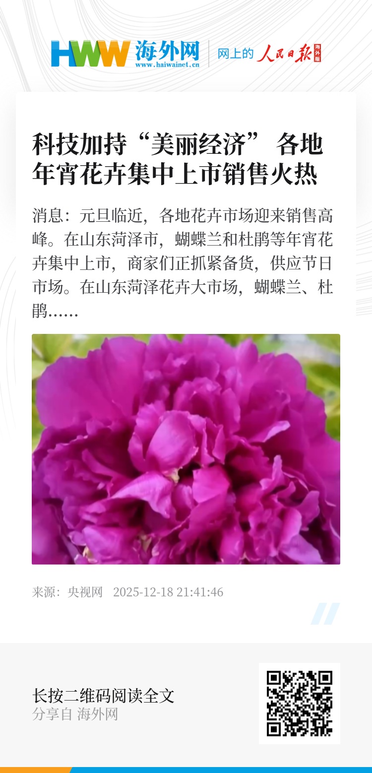 在河南洛阳市,当地花农通过科技手段调控花期,让牡丹抢在元旦前上市,供应节日市场。