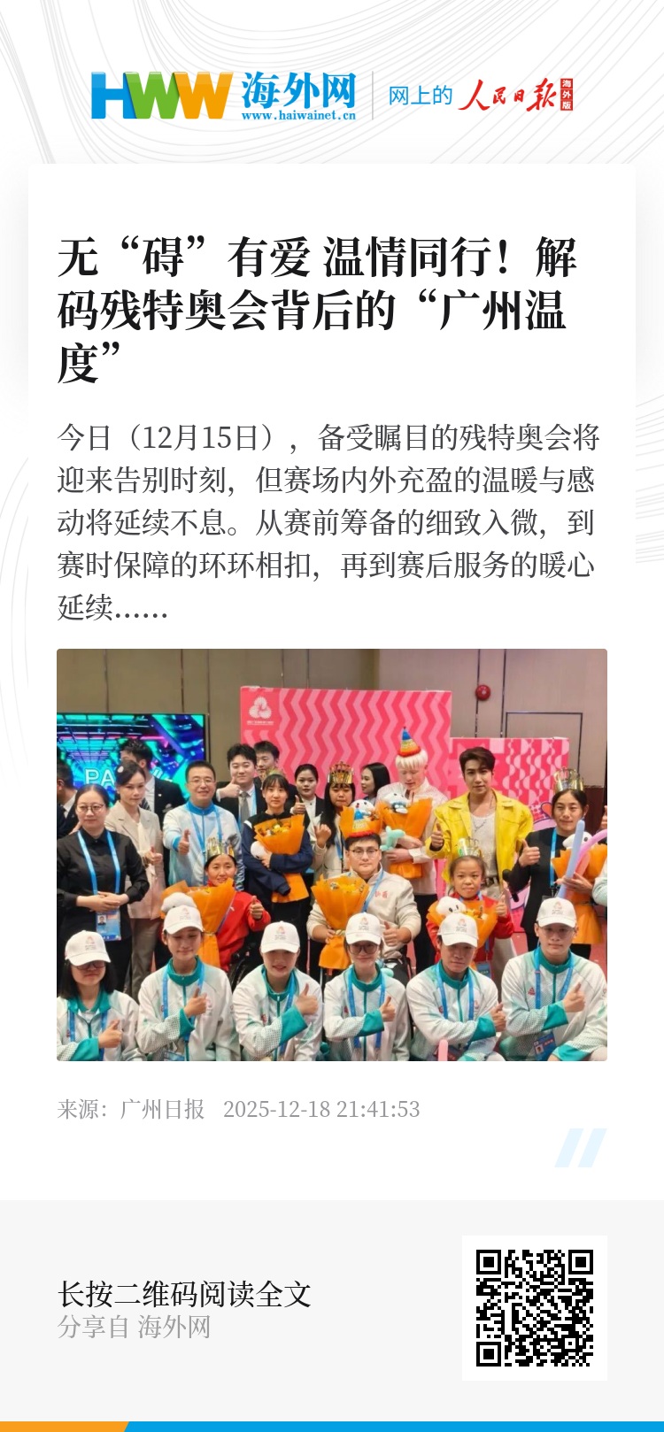 今日(12月15日),备受瞩目的残特奥会将迎来告别时刻,但赛场内外充盈的温暖与感动将延续不息。从赛前筹备的细致入微,到赛时保障的环环相扣,再到赛后服务的暖心延续,广州以文明之城的担当与温度,为这场体育盛事注入源源不竭的精神动力,每一处细节都饱含着对特殊群体的尊重与关怀,向世界展现了开放包容、友爱互助的城市品格,让文明之城底色愈发闪亮夺目。