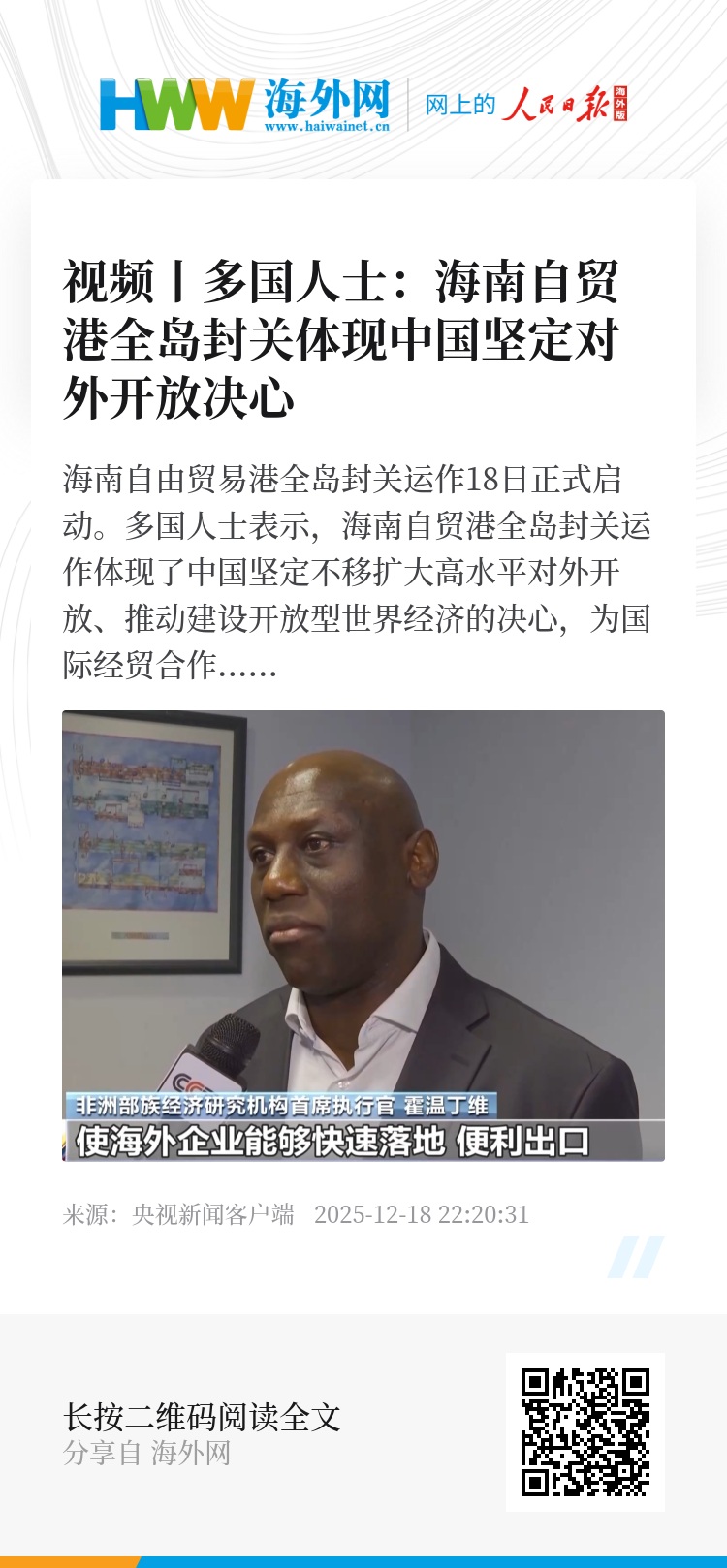 海南自由贸易港全岛封关运作18日正式启动。多国人士表示,海南自贸港全岛封关运作体现了中国坚定不移扩大高水平对外开放、推动建设开放型世界经济的决心,为国际经贸合作营造了开放、包容的环境。