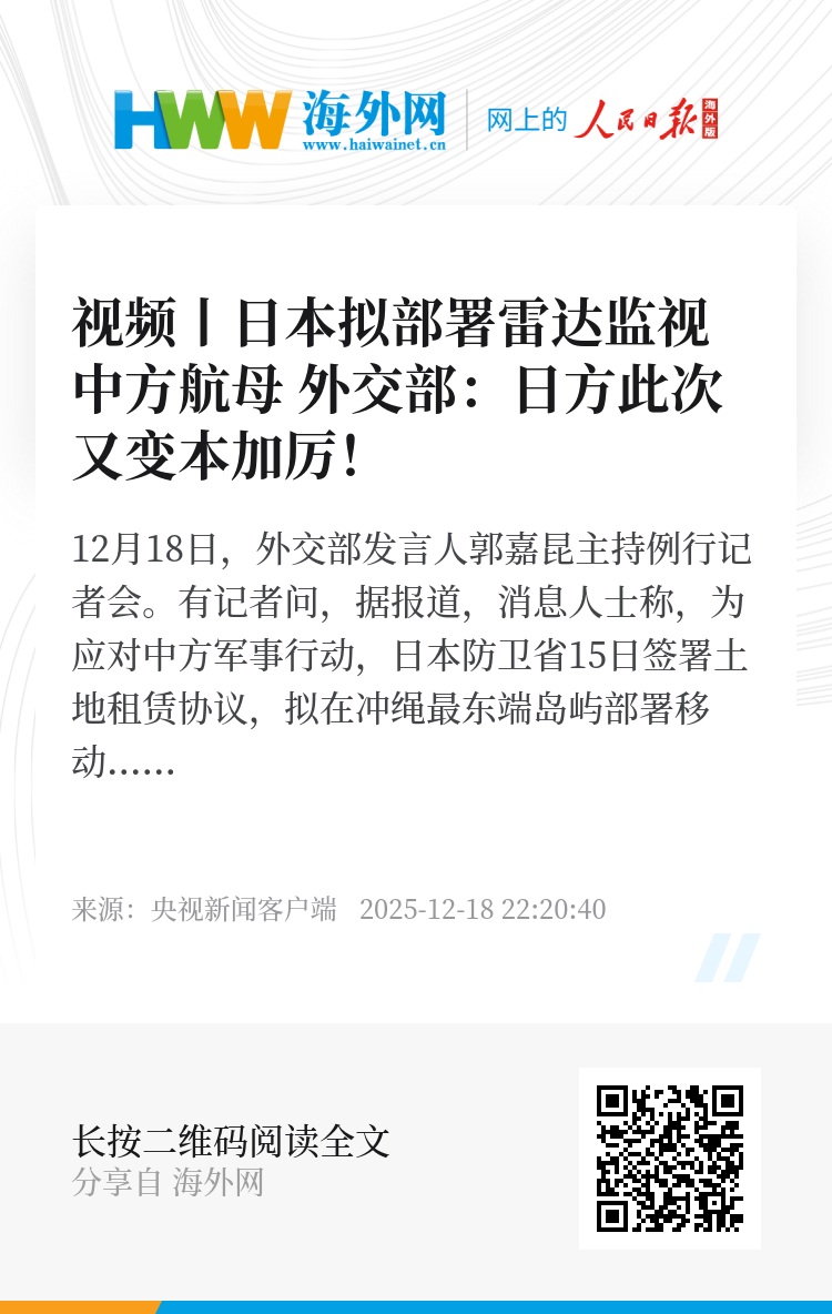 12月18日,外交部发言人郭嘉昆主持例行记者会。有记者问,据报道,消息人士称,为应对中方军事行动,日本防卫省15日签署土地租赁协议,拟在冲绳最东端岛屿部署移动雷达装置,监视中方航母、飞机在冲绳岛和宫古岛间海域活动。相关部署拟于2026年启动,预计将有约30人驻守。中方对此有何评论?