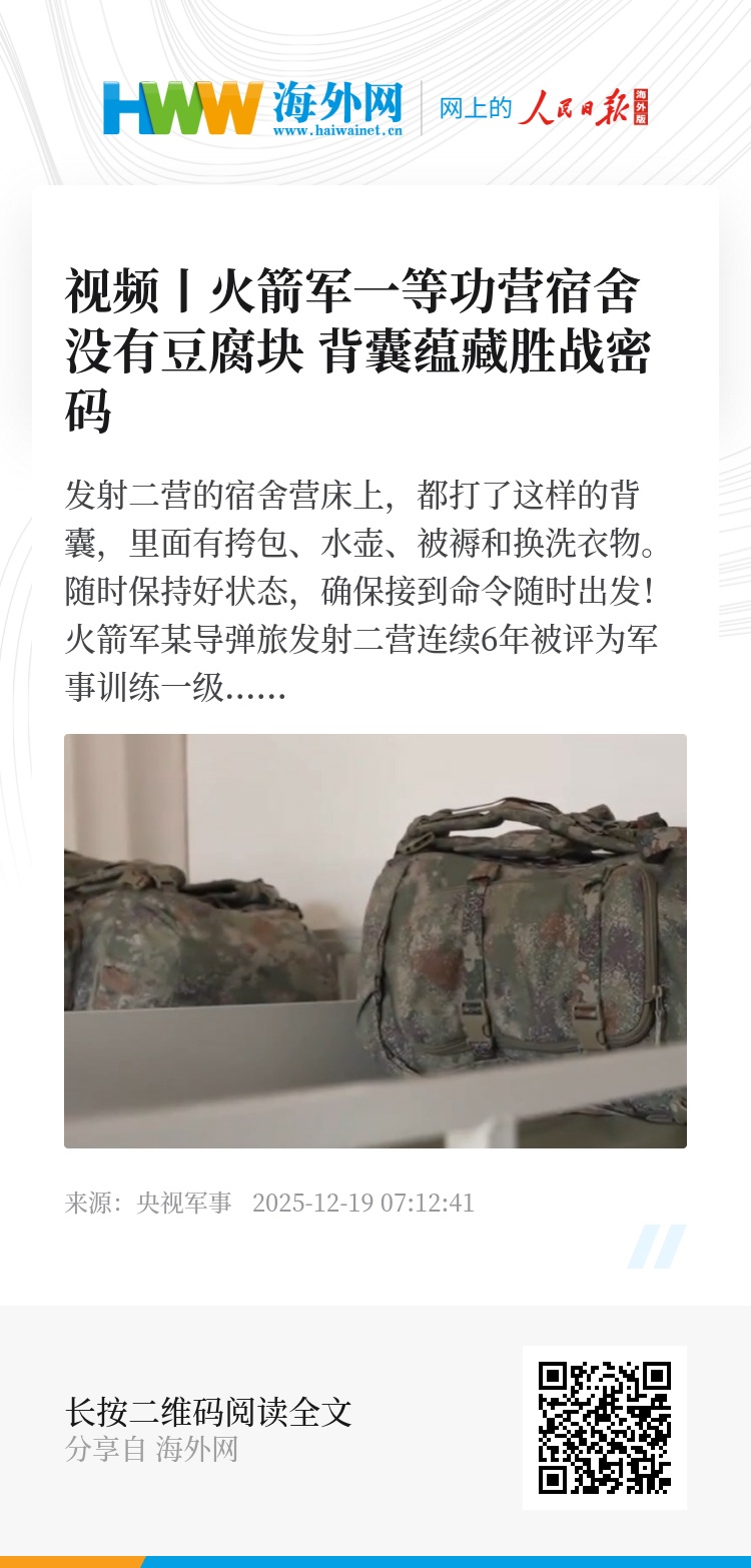 发射二营的宿舍营床上,都打了这样的背囊,里面有挎包、水壶、被褥和换洗衣物。随时保持好状态,确保接到命令随时出发!火箭军某导弹旅发射二营连续6年被评为军事训练一级单位,2024年荣立一等功,今年又获评第29届“中国青年五四奖章”。