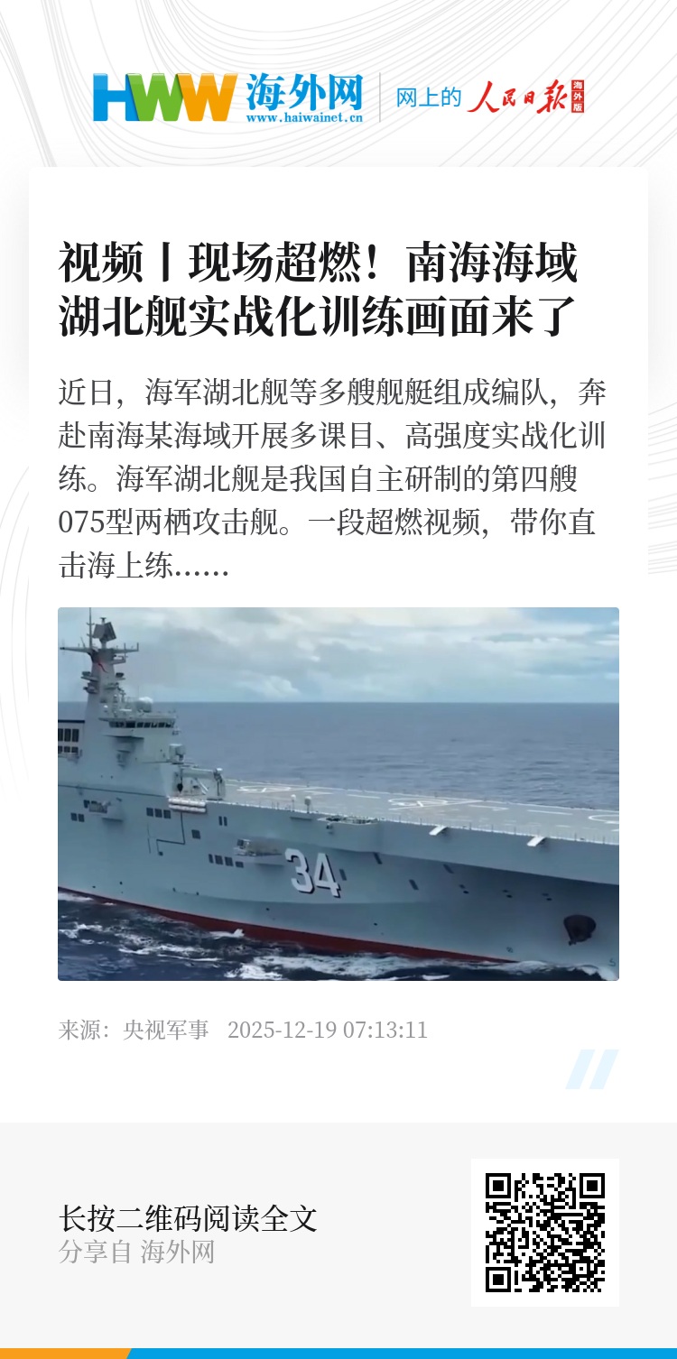 近日,海军湖北舰等多艘舰艇组成编队,奔赴南海某海域开展多课目、高强度实战化训练。海军湖北舰是我国自主研制的第四艘075型两栖攻击舰。一段超燃视频,带你直击海上练兵现场。