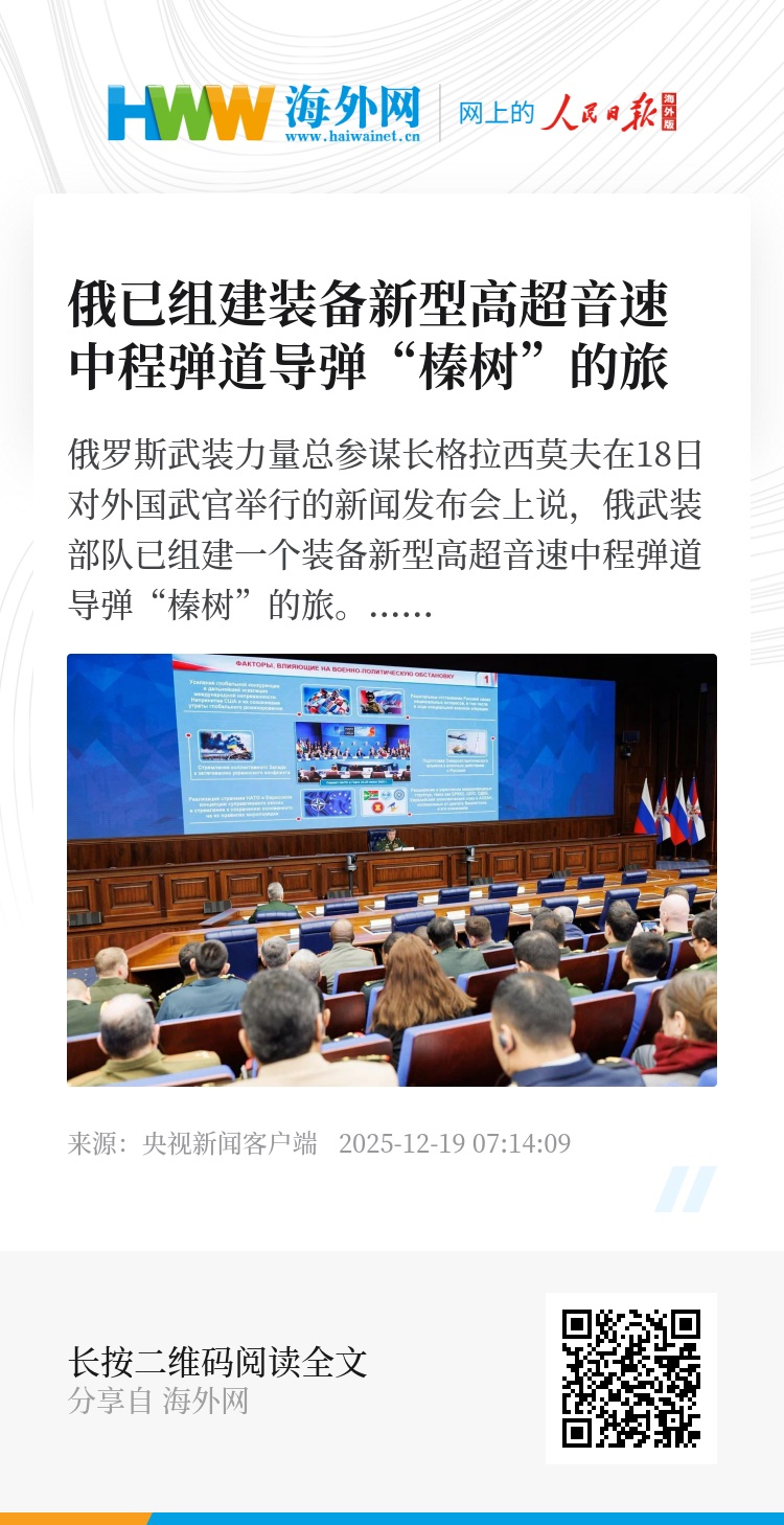 俄罗斯武装力量总参谋长格拉西莫夫在18日对外国武官举行的新闻发布会上说,俄武装部队已组建一个装备新型高超音速中程弹道导弹“榛树”的旅。