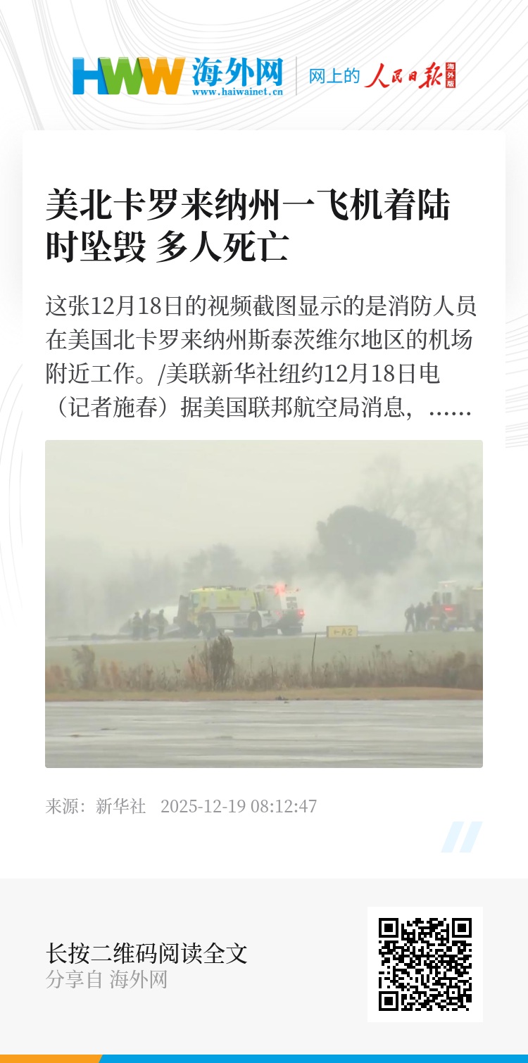 新华社纽约12月18日电(记者施春)据美国联邦航空局消息,一架载有6人的商用飞机18日10时许在北卡罗来纳州斯泰茨维尔地区的机场着陆时坠毁,引发大火。