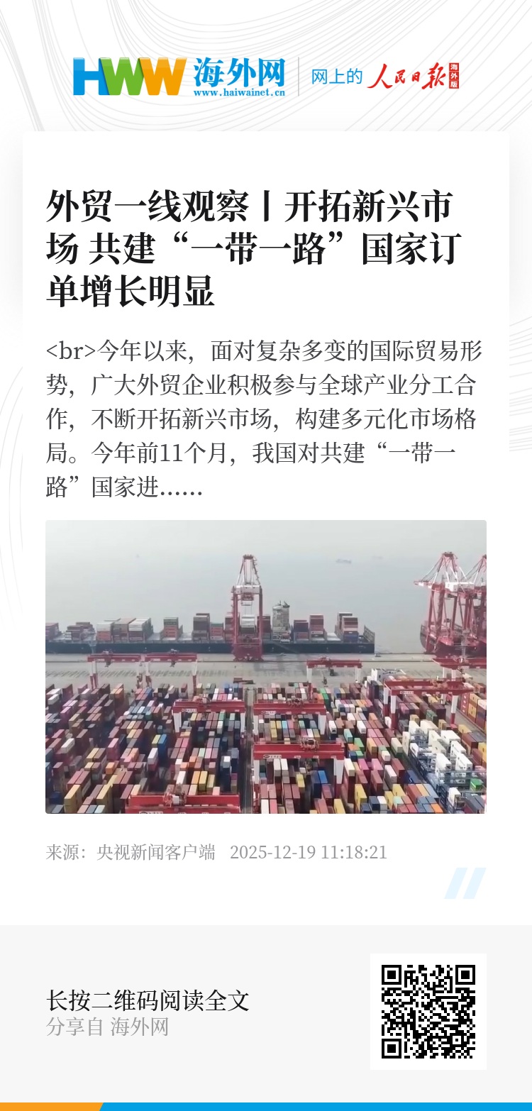 今年以来,面对复杂多变的国际贸易形势,广大外贸企业积极参与全球产业分工合作,不断开拓新兴市场,构建多元化市场格局。今年前11个月,我国对共建“一带一路”国家进出口超21万亿元,占全国外贸总值的一半以上。