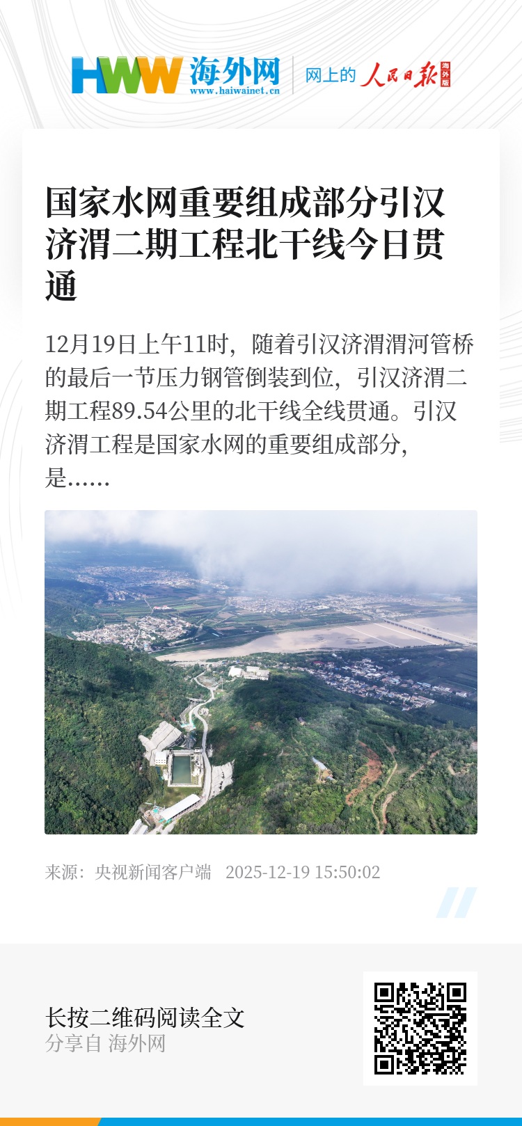 12月19日上午11时,随着引汉济渭渭河管桥的最后一节压力钢管倒装到位,引汉济渭二期工程89.54公里的北干线全线贯通。