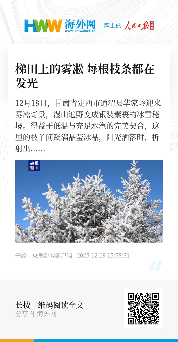 12月18日,甘肃省定西市通渭县华家岭迎来雾凇奇景,漫山遍野变成银装素裹的冰雪秘境。得益于低温与充足水汽的完美契合,这里的枝丫间凝满晶莹冰晶,阳光洒落时,折射出细碎光斑,与湛蓝天空相映成趣。(总台记者 柴世文 通渭融媒)