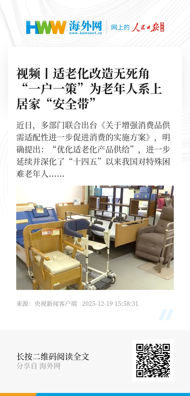 近日,多部门联合出台《关于增强消费品供需适配性进一步促进消费的实施方案》,明确提出:“优化适老化产品供给”,进一步延续并深化了“十四五”以来我国对特殊困难老年人家庭适老化改造的支持导向。各地民政部门通过“一户一策”等措施,持续增强特殊困难老年人家庭改造的供需适配性。